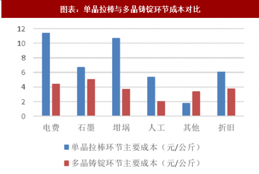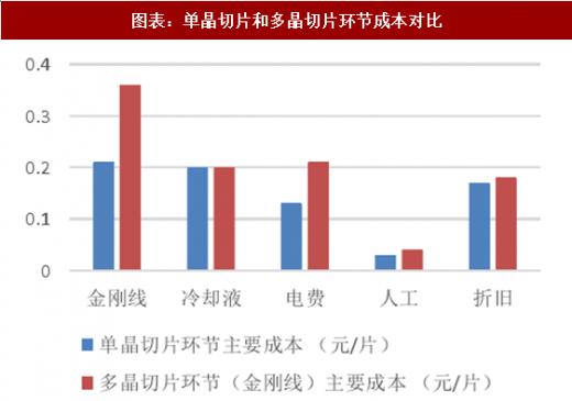 硅片分为单晶硅片和多晶硅片主要是根据生产工艺的不同,其差别主要在于拉棒和铸锭环节,切片环节乃至后续的电池、组件生产环节差异不大。其中拉棒后形成单晶硅棒,切片后形成单晶硅片;铸锭后形成多晶硅锭,切片后形成多晶硅片。硅片成本中,分为硅成本和非硅成本。硅成本则主要由多晶硅料的价格来决定的,多晶硅料的价格波动较大,因此在生产硅片时会考虑硅料的供给。从前文中得知国内硅料相比国外硅料价格波动大,硅料的供给也一直处于上升阶段,这对硅片扩产提供了保障。单晶和多晶的成本差别主要体现在拉棒和铸锭成本的差别上,一直以来,多晶对于单晶的成本优势建立在铸锭相对于拉棒更高的效率上。切片环节单多晶的切片成本大致相似,与选择的切割方式有关,金刚线切片的成本低于砂浆切片,而单晶的金刚线切片成本略低于多晶金刚线切片。