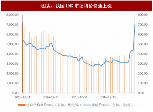 2017 年 11 月9 日中美签订能源大单,能源类项目合同金额达到 1700多亿美元,主要包括页岩气、lng、天然气发电、、煤制气等方面的贸易或生产。由于美国天然气价格相较于国内天然气价格便宜,以 lng 等形式从美国进口天然气是推进国内天然气利用的很好选择,有助于实现中美能源供需的对接,对于 lng 未来发展是一大机遇。另外,今年冬季北方地区大力推动“煤改气”,“2 26”城市冬季取暖禁煤,天然气供应不足,导致出现气荒,全国 lng 价格快速上涨,据生意社数据显示,2017 年 9 月 18 日国内液化天然气(lng)均价为 2973.85元/吨,至12月18日液化天然气均价为6929.17元/吨,3个月内涨幅高达133%。天然气行业面临季节性供不应求,对于上游天然气勘探开发企业、lng液化工厂、lng接收站等气源方收益明显。我们长期看好未来lng产业链的发展前景。