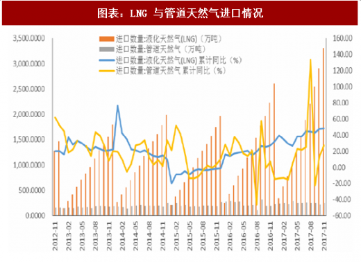 根据天然气“十三五规划”,2015-2020年管道一次运输能力的复合增速为7.4%,低于天然气消费量增速13.27%,需要lng(液化天然气)的运输来补足,这对于lng液化工厂、进口企业是一大发展机遇。2017年lng进口整体呈逐步上升趋势,下半年开始一直高于管道天然气进口量。由于国内对于天然气需求增长迅速,而管道建设的时间较长,lng得益于运输便利的优势,其进口量大于管道天然气进口量的情况将长期存在。