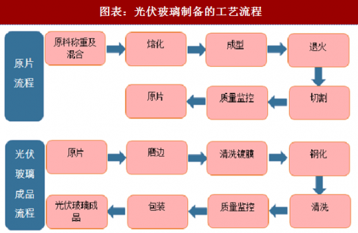 光伏玻璃通常采用压延法制备,其中生产过程可分为原片生产和深加工两个阶段;原片生产主要包括配料、熔化、压延、退火、裁切;在压延过程中,1100℃左右的熔融玻璃,经过压延机辊子以一定的速度压延、冷却,达到一定厚度、一定板宽、一定花型、透过率为91.5%的玻璃板,而后经过退火窑的退火,使玻璃板有相对稳定的应力曲线分布,达到具有一定的强度,不易破碎、有利于切割、加工的玻璃板。需要指出的是,光伏压花玻璃同浮法玻璃的生产线存在差异,假如光伏玻璃供不应求是无法从浮法玻璃生产线直接切换的。