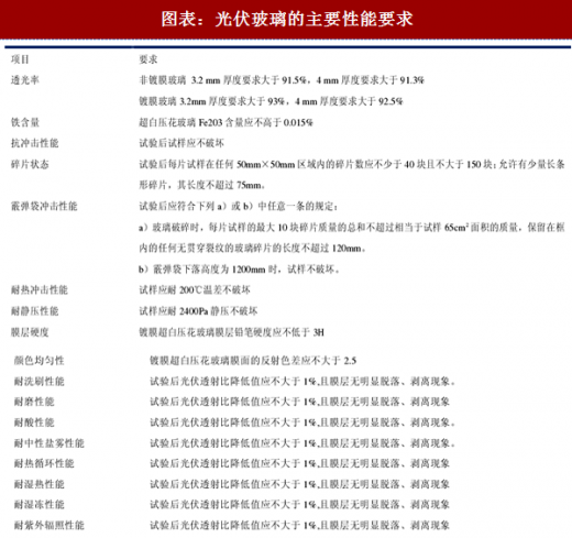 光伏玻璃必须具备良好的透光率,通常而言,未镀膜的钢片的透光率(380nm~1100nm波长范围)通常在91%以上,而经过深加工后的镀膜玻璃的透光率能够达到93.5%的水平。此外,光伏玻璃需要满足一定的耐候性和机械性能,根据gbt30984.1-2015《太阳能用玻璃第1部分超白压花玻璃》,用于光伏组件的光伏玻璃最低性能需满足下列要求。