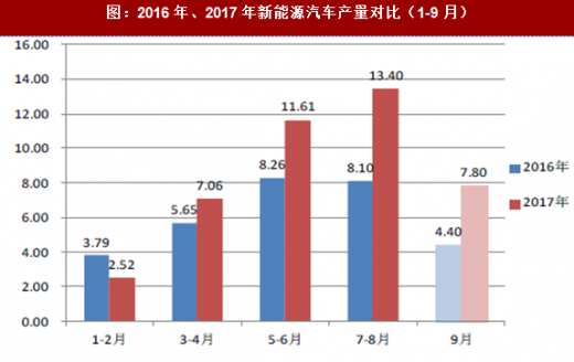 《关于调整新能源汽车推广应用财政补贴政策的通知》于2017年1月1日开始实施,提高推荐车型目录门槛并对新能源汽车补贴补贴标准进行调整。受此影响,2017年上半年我国新能源汽车的产销量未达预期,尤其是2017年1-2月产量低于上年同期。但伴随新能源汽车推广应用推荐车型目录逐步落地,我国新能源汽车产量自5月份起已出现明显的回暖趋势。2017年7-8月,我国共生产新能源汽车13.40万辆,相比上年同期强劲增长65.43%。