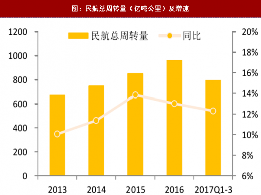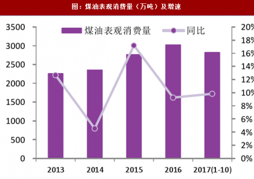 2016年和2017年1-10月,国内煤油表观消费量分别为3026万吨、2823万吨;同比增速分别为9.25%、9.83%。近几年煤油消费增速较高,一方面是相对于汽柴油来说基数低,另一方面是受益于航空业的发展,航空煤油需求良好。2016年和2017年前三季度,全国民航总周转量分别为962.51亿吨公里、796.70亿吨公里,近两年同比增速有所回落,但仍保持在10%以上的高位,高于2013、2014年。