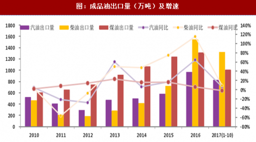 近几年汽油消费增速逐年下降至今年前十个月的2.77%,但考虑到汽车保有量增速维持10%以上,且明年增速或超今年,加之2017年上半年机动车保有量增速提升,汽油消费增速进一步下降的空间不大。柴油经历了2016年的消费低谷之后,2017年消费增速开始由负转正,需求情况开始好转。
