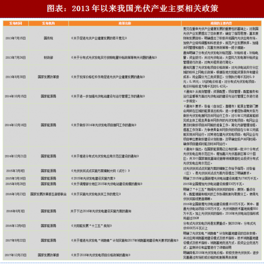 但是由于我国光伏产业的盲目扩张造成产能严重过剩、欧洲债务危机导致光伏发电市场需求萎缩以及欧美对我国实施的光伏“双反”(反倾销、反补贴)等原因,随后我国光伏产业陷入“寒冬”,2011 年成为了我国光伏制造产业的转折点。为规范和促进光伏产业健康发展,2013 年我国政府密集推出了一系列光伏产业相关政策,特别是被业内称之为“国八条”《关于促进光伏产业健康发展的若干意见》,明确提出了积极开拓国内光伏应用市场、加快产业结构调整和科技进步、规范产业发展秩序、加强并网管理和服务、完善支持政策等一揽子措施。之后,补贴、退税、电价、项目管理、并网以及金融服务等若干配套政策相继出台,对光伏产业发展及国内市场应用形成强有力支持,有力地推动了光伏发电呈现出良好发展态势。但是,由于全国各地区还存在不同程度的政策尚未完全落实、配套措施缺失、工作机制不健全等问题,为破解分布式光伏发电应用的关键制约,大力推进光伏发电多元化发展,加快扩大光伏发电市场规模,2014年分布式光伏发电获政策大力支持,国家能源局相继印发了《关于进一步落实分布式光伏发电有关政策的通知》等四部相关政策,以继续完善分布式光伏发电政策体系和管理机制,推动各项配套政策措施积极落实,助力分布式光伏发电有序健康发展。2015年光伏发电建设实施方案下发,光伏扶贫工程试点方案编制有序推进等政策利好再次提升了光伏行业发展预期。2016年,光伏扶贫相关政策出台推动了全国各地光伏扶贫工作全面展开,在带动贫困地区经济发展和民生改善的同时,也为光伏产业发展带来契机。2017年,光伏发电“领跑者”计划和基地建设的有序推进不仅促进了行业优胜劣汰,加速行业洗牌,同时,加强领跑基地的建设也加速科技研发成果的应用转化,带动和引领光伏发电技术进步和市场应用。