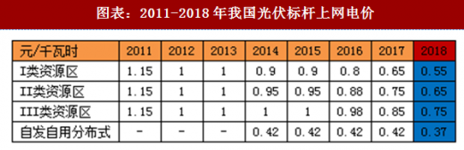 《通知》规定,2018年1月1日之后投运的光伏电站,一类、二类、三类资源区标杆电价分别降低为每千瓦时0.55元、0.65元和0.75元,比2017年电价每千瓦时均下调0.1元。2018年1月1日之后投运的分布式光伏发电,对“自发自用、余电上网”模式,全电量补贴标准降低为每千瓦时0.37元,比现行补贴标准每千瓦时下调0.05元。同时,为积极支持光伏扶贫,助力打赢脱贫攻坚战,更好地保障贫困户收益,保持村级光伏扶贫电站(0.5兆瓦及以下)标杆电价、户用分布式光伏扶贫项目度电补贴标准不降低。即村级光伏扶贫电站一类、二类、三类资源区标杆电价分别为每千瓦时0.65元、0.75元和0.85元,户用分布式光伏扶贫项目度电补贴标准为0.42元。