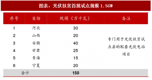 光伏扶贫首批试点规模 1.5gw,第一批项目总规模 5.16gw。2014年 10月,光伏扶贫工作开始实施,选择了宁夏、安徽、山西、河北、甘肃、青海6省开展首批光伏试点,首批试点规模为1.5gw。2016年10月,能源局和扶贫办下达第一批光伏扶贫项目,涉及 14 个省,总规模 516 万千瓦,其中,村级光伏电站(含户用)共计218万千瓦,集中式地面电站共计298万千瓦。