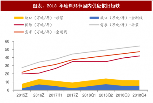 2018 年国内硅料供需依旧不匹配,硅料仍需进口。通过考虑2018年硅料扩产计划、单晶硅片扩产计划以及多晶转金刚线进度等因素,我们判断无论多晶转金刚线的进程如何,2018年国内多晶硅的供应量都无法满足国内硅片的产能要求。比如,多晶全部转金刚线后,2018年的缺口在5-7万吨/年左右,这部分缺口还是需要从国外进口。硅料环节的价值在2018年依旧凸显。