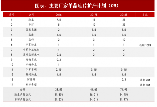 2018 年单晶硅片产能放量,单晶渗透率或将提升。由于单晶在效率方面的优势,单晶渗透率不断提升,但单晶硅片产能不足,2016年单晶硅片产能仅为24gw,制约渗透率提升。目前各大企业扩产项目的产能陆续释放,预计2018年底产能将超过70gw。在目前单晶硅片价格5.4元/ 片的基础上,单晶组件已经具有性价比,加之单晶技术路线未来提升效率的空间比较大,因此我们预计随着单晶硅片产能的释放,单晶渗透率将提升。
