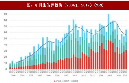光伏行业已悄然发生变化,不再是昔日一个市场变动,全球行业伤筋动骨的年代,光伏行业2011年在欧洲达到顶峰,2017年也许在中国也达到顶峰,但是全球来看,行业投资近几年一直是向上的,因为新兴市场正在崛起。彭博新能源财经最新发布的二季度清洁能源投资数据,投资638亿创2016年二季度以来的新高,环比上升21%。这主要受益于阿联酋两大光伏项目20亿美元的投资;美国和中国投资相比上季度分别上涨51%和32%,墨西哥、澳大利亚和瑞典额急剧增加,埃及、阿根廷创历史新高。全球清洁能源迎来复苏。