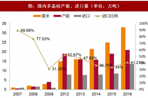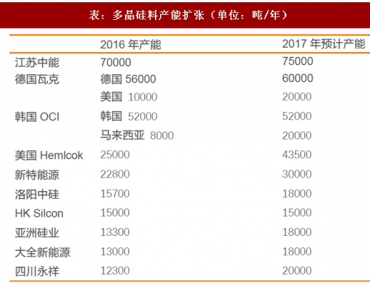 且按照近两年产能扩张比较大的厂商规划,2017年隆基股份、中环股份扩张产能超过15gw,国内硅片产能占比还有继续提升的趋势。所以,国内多晶硅料对硅料的需求还会继续提升。