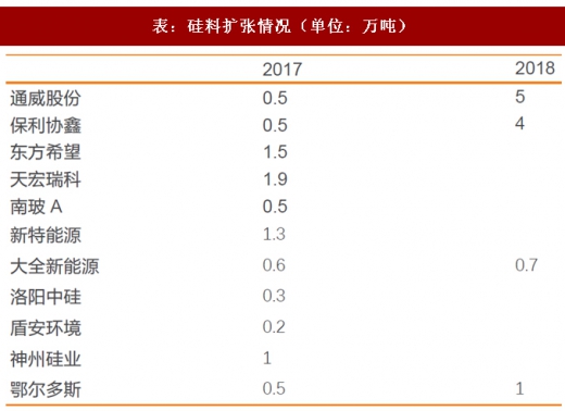 2017年全年国内硅片产出或达到75gw,对应需要约38万吨的硅料。按照主要龙头企业扩产的计划,2018年国内硅片产能将超过100gw。假设明年全球下游装机需求稳定增长,国内硅片产能利用率维持在85%,对应硅片产出约85gw。考虑单晶硅片硅料使用下降,大约需要40-42万吨的硅料产能。