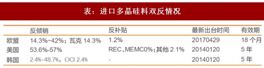 国外多晶硅厂商多为大型化工厂,掌握先进的提纯工艺,国内厂商前几年并没有成本优势。2014年开始国内对来自美国、韩国、欧盟的多晶硅征收双反税,限制进口,但是主要进口企业瓦克(14.3%)、oci(2.4%),尤其是韩国征税水平较低,过去两年,国内硅料需求大幅增长,进口量依赖依然很高。