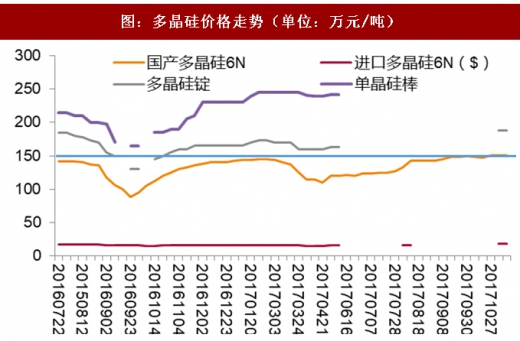 上半年国内多晶硅均价为12.66万/吨,一季度价格上升到14.27万/吨后出现下滑,5月份受国内抢装需求和美国201法案调查推动的囤逐渐行动推动,加之三季度部分国内厂商检修,环保督查影响生产,从5月份多晶硅价格一路上涨,截止最近交易价格位于15万~15.5万/吨之间。