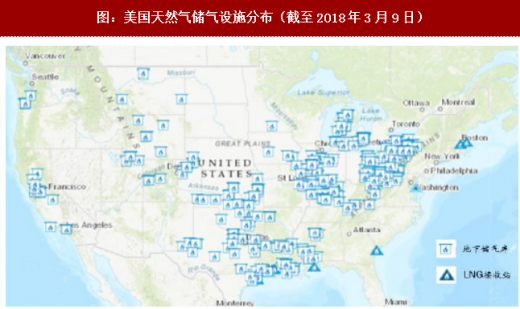 美国以地下储气库为主要的调峰手段,是目前全球地下储气库发展和应用最成功的国家之一。根据eia数据,截至2016年底,美国地下储气库总规模2616亿立方米,占全美天然气消费量的33.6%,能够满足约108天的天然气用气需求。截至2017年9月,美国共有389个地下储气库处于正常运营状态,储气库遍布在美国各州,在人口密集、冬季用气量大的东部地区分布最为密集,与天然气发电厂的分布位臵相关,同时呈现出地理分布与消费需求相呼应的特点。