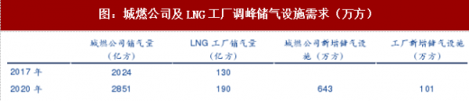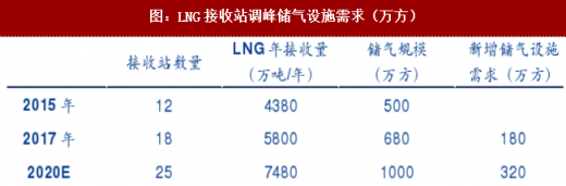 近中期lng的调峰能力必须依靠lng接收站、液化工厂和城燃公司调峰储配站等构成。短期而言,要加快建立和完善城市应急储气调峰设施,在用气负荷中心城市,加快建设lng储罐、cng球罐及配套储气设施,解决重点城市的日、小时调峰和应急用气需求。假设,城燃公司按照日销气量峰值的3到5倍来投建储气设施,lng液化工厂亦按照日销气量的3到5倍来投建储气设施。预计城燃公司2018年-2020年新增储气设施规模为643万方,lng工厂2018年-2020年新增储气设施规模为101万方。