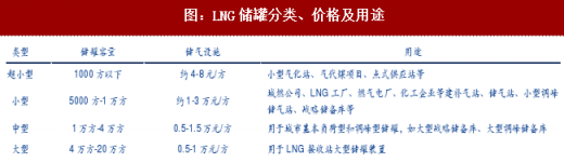 综合考虑未来天然气调峰及应急储备需求,分别测算得到产业链中游和下游主要单位的调峰储气需求。2020年之前,预计中游环节的lng接收站、城市燃气公司和lng工厂分别需要建设lng调峰储气设施的规模为320万方、643万方和101万方;预计下游环节的需要建设lng调峰储气设施的规模为121万方。预计2018年-2020年之间的lng储气调峰设施累计需求约为1200万方。根据不同lng储罐罐容的类型及用途,推断lng接收站主要采用大型储气设施,城燃公司和lng工厂主要采用中型储气设施,并搭配建设小型和超小型储气设施,终端下游用户(燃气电厂、工业燃料用户以及化工企业)主要采用小型和超小型储气设施。根据具体储罐的使用规模及储罐的当前市场价格,推算出整个天然气储气设施在2018-2020年的市场空间将有望达到1000-1500亿元。