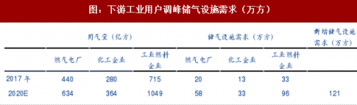 按照发改委要求,下游用户也需承担一定规模的储气任务。假设2020年能够建成使用2天的储量,三类大型工业用户在2018年-2020年的累计储气设施需求为121万方,其中燃气电厂、化工企业和其他工业燃料企业的新增需求分别为38万方、20万方和63万方。