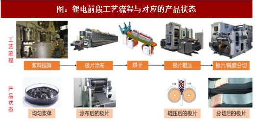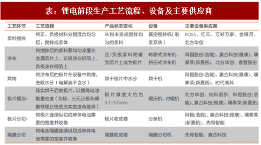 锂电池前段工艺的结果是将锂电池正负极片制备完成,其第一道工序是搅拌,即将正、负极固态电池材料混合均匀后加入溶剂,通过真空搅拌机搅拌成浆状。配料的搅拌是锂电后续工艺的基础,高质量搅拌是后续涂布、辊压工艺高质量完成的基础。涂布和辊压工艺之后是分切,即对涂布进行分切工艺处理。如若分切过程中产生毛刺,则后续装配、注电解液等程序,甚至是电池使用过程中将出现安全隐患。锂电生产过程中的前端设备,如搅拌机、涂布机、辊压机、分条机等是电池制造的核心机器,关乎整条生产线的质量,因此前段设备的价值量(金额)占整条锂电自动化生产线价值量的比例最高,约35%。根据的测算,2017-2020年全球锂电设备市场规模将从781亿增加至1436亿,对应2018-2020年每年新增市场规模分别为148亿、206亿和301亿;其中前端设备市场规模预计将从2017年的273亿增加至2020年的503亿元,对应2018-2020年每年新增市场规模分别为52亿、72亿和105亿元。