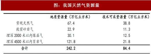 我国天然气资源潜力较大,根据2015年全国资源动态评价结果显示,我国天然气地质资源量90.3万亿立方米、可采资源量50.1万亿立方米,其中包括致密气地质资源量22.9万亿立方米、可采资源量11.3万亿立方米。埋深2000米以浅煤层气地质资源量30.1万亿立方米,可采资源量12.5万亿立方米。全国埋深4500米以浅页岩气地质资源量121.8万亿立方米,可采资源量21.8万亿立方米。