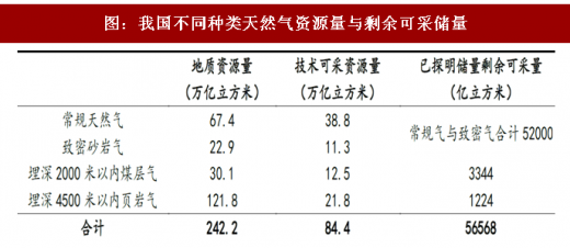 截至2016年底,全国累计探明常规天然气(含致密气)地质储量11.7万亿立方米,累计产量1.4万亿立方米,资源探明率13.0%,探明储量采出程度12.4%,剩余可采储量5.2万亿立方米;累计探明地质储量6928.3亿立方米,累计产量241.1亿立方米,资源探明率2.3%,探明储量采出程度3.5%,剩余可采储量3344亿立方米;累计探明页岩气地质储量5441.3亿立方米,累计产量136.2亿立方米,资源探明率0.4%,探明储量采出程度2.5%,剩余可采储量1224.1亿立方米。中国天然气资源探明率和探明储量采收率均较低,通过科技创新、技术进步可释放较大的资源潜力。