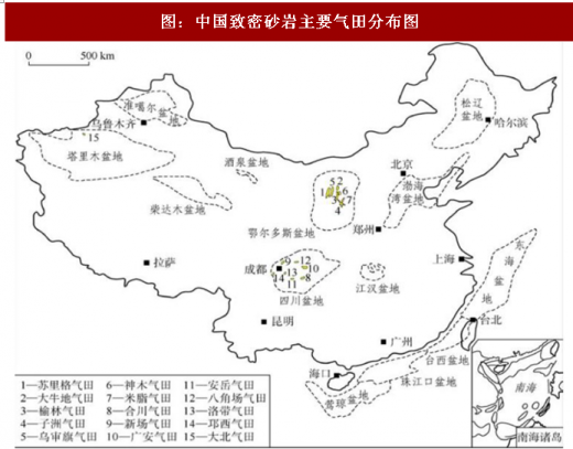 我国致密气技术可采资源量11.3万立方米,约占全国主要种类天然气可采资源量的13.39%,广泛分布于鄂尔多斯、四川、松辽、渤海湾等多个盆地,其中约有90%分布在鄂尔多斯盆地和四川盆地。其中,鄂尔多斯盆地地质储量丰富,致密砂岩气技术可采资源量3-4万亿立方米,苏里格气田是典型代表。四川盆地也有丰富的致密气储层,致密砂岩气技术可采资源量2-3万亿立方米,区域上主要分布在川西和川中地区。塔里木地区致密砂岩气技术可采资源量1.5-1.8万亿立方米。三大地区致密气储量约占资源总量的80%。还有少量存在于渤海湾、柴达木等盆地中,也是未来重点勘探开发的区域。
