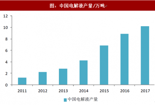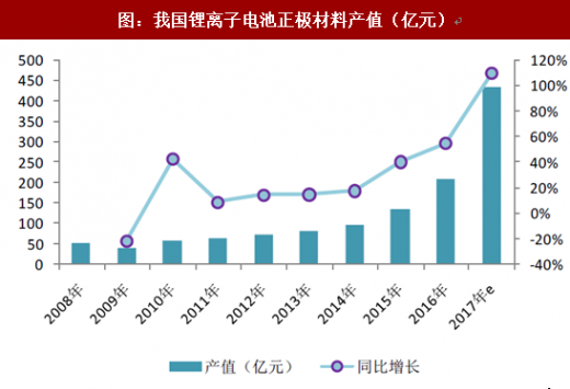 国内锂电池尤其动力锂电池出货量快速增长,带动了上游正极材料、电解液等关键材料产量的提升。根据高工产研锂电研究所(ggii)统计数据显示,2017年我国锂离子电池正极材料产量20.8万吨,同比增长28.47%,预计产值436亿元左右,同比增速超100%,产值增速大幅增长的原因主要系2017年电解钴价格涨幅超过100%,碳酸锂价格涨幅超过30%,且三元材料占比提高,导致正极材料均价大幅上涨所致。