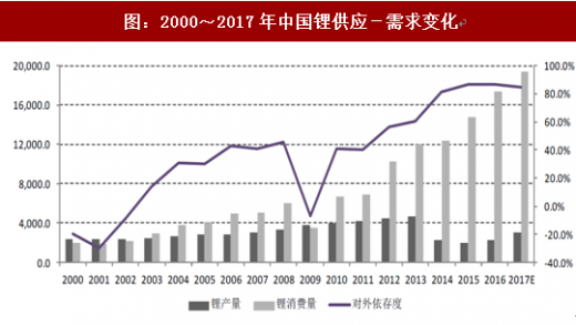 锂电池产业的快速发展,致中国已成为目前世界第一的锂消费大国,几乎占用了全球每年40%的原锂资源产量,为此需大量进口。一方面,我国新能源汽车作为七大新兴产业领域之一,得到了国家的大力支持,按照工信部的《汽车产业中长期发展规划》,2020年新能源汽车产量达200万辆,需要增加10~14万吨碳酸锂的消耗(合1.80~2.52万吨金属锂);再一方面,我国国内锂资源的需求量也从2001年的1,850.00吨增至2016年的17,350.00吨,2017年约接近2万吨;而同期我国国内锂资源的产量从2013年的4,700.00吨的高点降低到2016年的2,300.00吨,缺口越来越大,对外依存度超过85%。2016年底,中国锂盐产能折合碳酸锂约17万吨,而中国的锂盐生产当中,其中绝大部分仍然依赖于进口锂辉石加工,占比超过70%,2016年我国从海外进口锂辉石49万吨,我国自产锂辉石矿仅有3.8万吨,总量相差悬殊。
