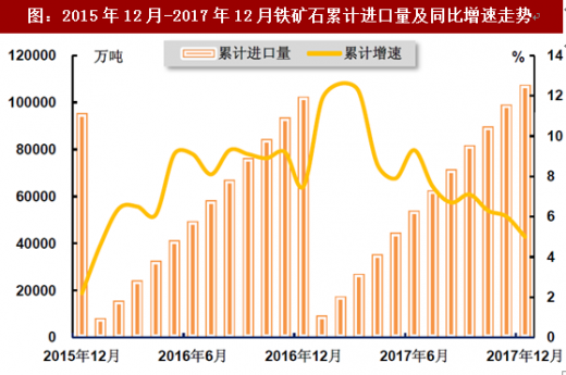 铁矿石进口增速放缓,但进口量再创新高。受制于国内矿山资源禀赋相对较差,我国铁矿石对外依存度长期处于较高水平,进口量不断突破新高,2016年首次突破10亿吨。2017年以来,国内环保压力持续加大,钢厂对高品位矿石的需求不减。4季度,我国铁矿石进口规模依然维持较高水平,累计进口量再次突破10亿吨,并创出历史新高。海关总署数据显示,2017年1-12月,我国铁矿砂及其精矿进口107,474.0万吨,同比增长5.0%,增速较2017年1-9月和上年同期分别回落2.1个和2.5个百分点。