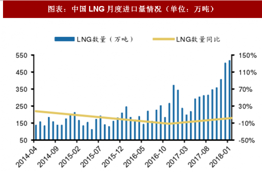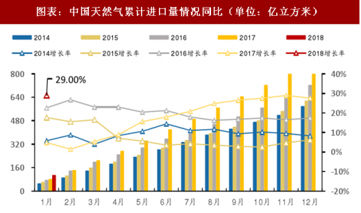 据发改委数据显示,2018年1月天然气进口量108.9亿立方米,同比增长29%。2017年全年天然气进口量累计920亿立方米,同比增长27.6%,较2015、2014年全年累计进口量分别增长49.8%和59.2%。自3月扭转下降态势后,增速保持较高水平,2017年10月、11月和12月,我国天然气进口量分别为78亿、95亿、103亿立方米,同比增速分别为36.8%、41.8%、18.4%。进口端受国际气价下滑影响,2016年初以来我国天然气进口保持旺盛增长态势,但由于2016年1月同比基数较高达76亿立方米,2017年1月进口量80亿立方米,同比仅增长4.8%。2017年2月进口量为61亿立方米,同比下降2.8%,为从2016年8月以来首次同比下降,总体进口增长趋缓。2016年,我国天然气进口量721亿立方米,增加17.4%。根据海关总署数据显示,2018年1月天然气进口量777.09万吨,同比增长33.36%。