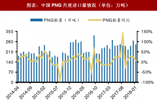 图表:中国png月度进口量情况(单位:万吨)