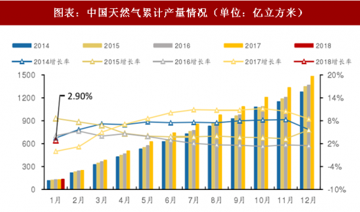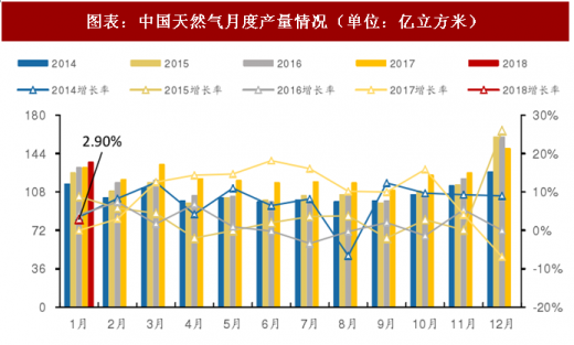 二、2018年1月天然气产量136亿立方米,同比增长2.9%