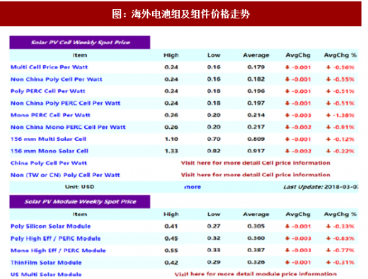 考虑到1季度全球需求强度低于之前的估计,太阳能电池板价格仍处于下行趋势的轨道。在中国,由于国内需求持续低迷,太阳能电池板供应商竞争加剧,价格走势也延伸至其他海外国家。继印度太阳能制造商协会撤回其对来自中国,台湾和马来西亚的光伏进口的反倾销请愿书后,更多光伏组件供应商,特别是中国组件供应商,已重新启动向印度的出货,使印度组件价格降低。在日本和欧盟,需求也开始减少,导致这些地区的组件价格下降。在美国,中国主要的太阳能电池板制造商继续大幅降价以消化4q17的库存。随着上游原材料的调整和即将到来的季度财务结算,组件制造商甚至在价格竞争不断加剧的情况下将价格降至更大的范围。此外,更多组件供应商倾向于首先调低高效产品的价格,导致多晶perc和单晶perc组件以显着的速度下降。