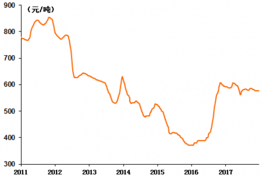 图:2011年1月-2017年12月bspi动力煤综合平均价格(5500大卡)变化趋势
