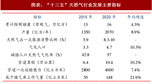 2015 年,我国天然气干线管道里程 6.4 万公里,天然气一次输送能力 2800 亿立方米,lng 接收能力 4380 万吨/年,地下储气库工作气量 55 亿立方米,全国城镇天然气管网里程达到 43 万公里,用气人口 3.3 亿人。