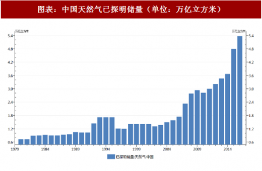 截至 2015 年底,我国常规天然气地质资源量 68 万亿立方米,累计探明地质储量约 13 万亿立方米,探明程度 19%,处于勘探早期。2016 年,我国天然气探明储量为 5.37 万亿立方米,储产比为39.3 年。