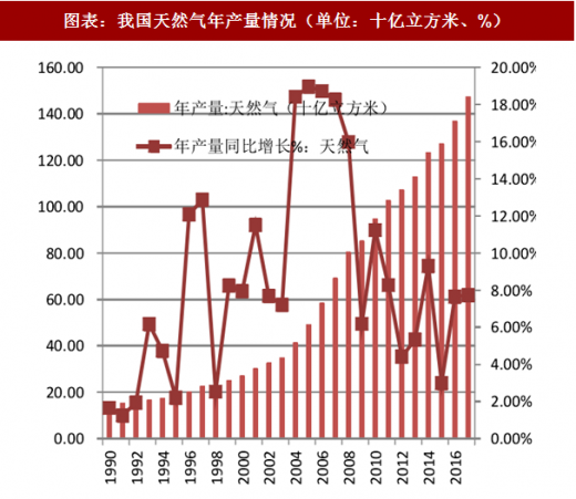 2017 年,我国天然气产量 1474 亿立方米,同比增长 7.70%。