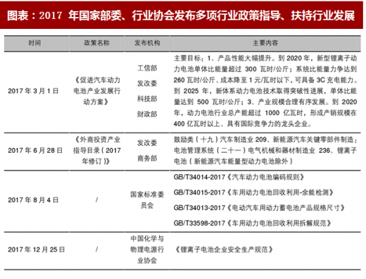 2017 年,工信部、发改委、科技部、财政部、商务部等多部委出台与锂动力电池相关的政策,为动力锂电池行业发展提供了明确的发展目标、清晰的发展路径、恰当的发展保护、持续的多面扶持,以及前瞻性的政策铺垫。