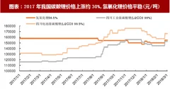 图表:2017年我国碳酸锂价格上涨约30%,氢氧化锂价格平稳(元/吨)