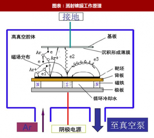 pvd 技术已成为主流,主要包括溅射镀膜和真空蒸发镀膜。溅射镀膜是指利用离子源产生的离子,在真空中经过加速聚集,而形成高速度的离子束流,轰击固体表面,离子和固体表面原子发生动能交换,使固体表面的原子离开固体并沉积在基板材料表面的技术。被轰击的固体是用溅射法沉积薄膜材料的原材料,称为溅射靶材。