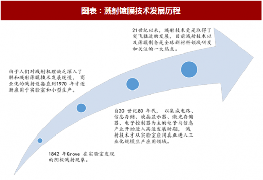 溅射镀膜技术被公认为起源于 1842 年 grove 在实验室发现的阴极溅射现象,具有可重复性好、膜厚可控制,可在大面积基板材料上获得厚度均匀的薄膜,所制备的薄膜具有纯度高、致密性好、与基板材料的结合力强等优点,已成为制备薄膜材料的主要技术之一,各种类型的溅射薄膜材料已得到广泛的应用。因此,溅射靶材这一具有高附加值的功能材料, 在巨大市场需求的拉动下已成为目前市场应用量最大的 pvd 镀膜材料,全球各靶材厂商正在不断探索和完善靶材制备技术,研发新的高品质溅射靶材。