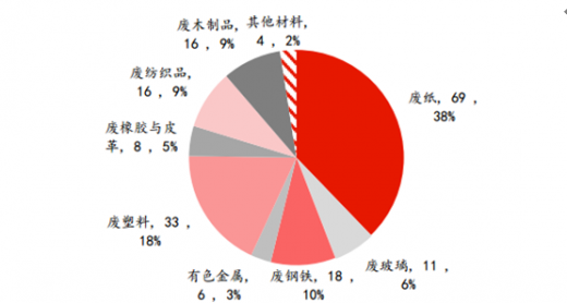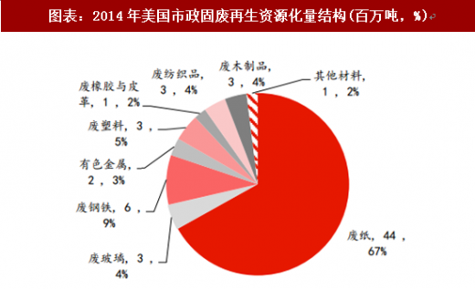 分产品类别来看,再利用量最高的是废纸,再利用量达到0.44亿吨,占总再利用废物总量的67%,再利用率最高的也是废纸,2014年回收再利用率达到65%。