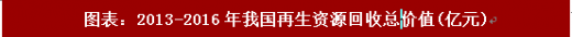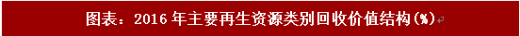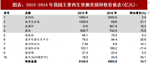 2016年我国再生资源回收总值为5902.8亿元,2016年受下游大宗商品价格上涨影响,主要再生资源品种价格持续走高,总回收价值同比增长14.7%,其中废电池、废有色金属增幅达34.1%和31.1%。