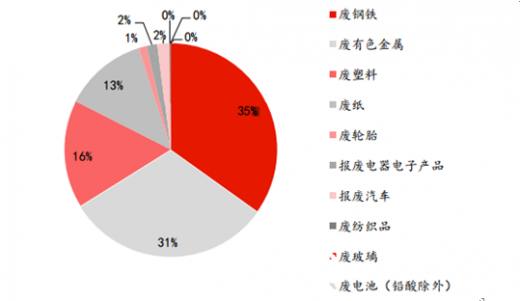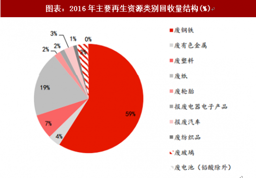 废、废、、、是再生资源回收的主要市场,回收价值合计占比超过95%。2016年,我国废钢铁、废有色金属、废塑料、废轮胎、废纸、废弃电器电子产品、报废汽车、废旧纺织品、废玻璃、废电池十大类别的再生资源回收总量约为2.56亿吨,同比增长3.7%。