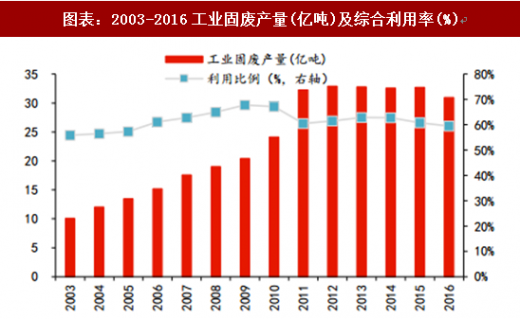 而从一般工业固废来看,我国工业固废的快速增长时期为2003-2011年,年均复合增速达15.7%,我国工业固废产量在2011-2016年逐渐保持稳定,2016年我国工业固废产量达到30.9亿吨,较15年虽有小幅下滑,但仍维持30亿吨以上水平。