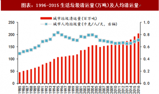 从城市垃圾清运量来看,我国城市人均垃圾清运量在2005年后保持稳定,2016年城市人均垃圾清运量在0.7千克/天;我国城市垃圾清运量则由2001年的1.35亿吨增长至2016年的2.04亿吨,增长了51%,年均复合增速为2.8%。
