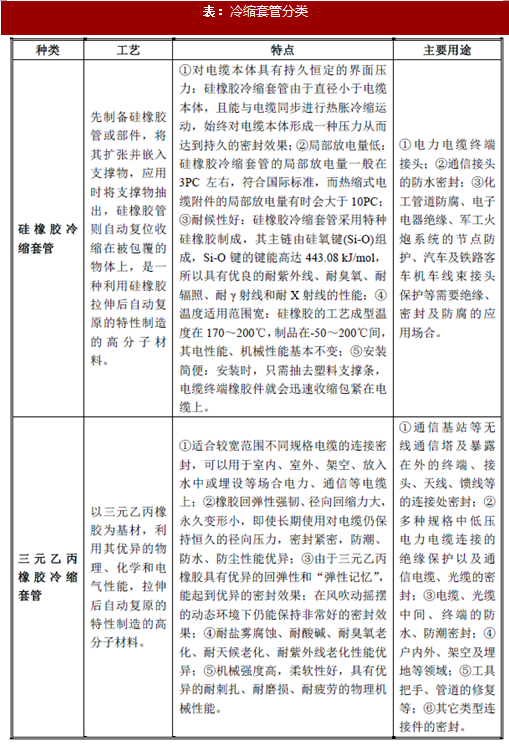 冷缩套管是冷缩电缆附件重要组成部分,具有绝缘、密封、防护等功能,是冷缩式电缆附件户内、户外终端中广泛采用的一种部件。常见的冷缩套管主要有硅橡胶冷缩套管及三元乙丙橡胶冷缩套管。具体情况如下表所示:
