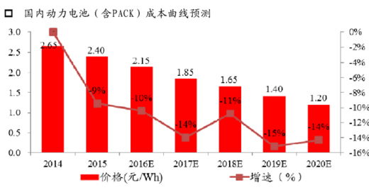 未来五年电池组的平均价格将以年均约12%的幅度降低,到2020年电芯 pack组件价格在1.2元/wh以下,单体的价格在0.8-0.9元/wh的水平,将极大降低成本, 明年上半年价格下调的压力预计最大。