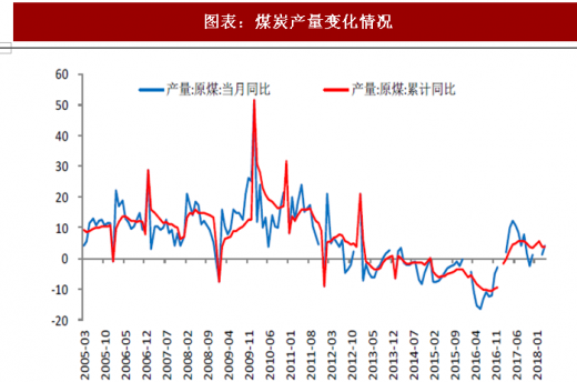 2018年4月原煤产量当月同比上升4.1%,累计同比上升3.8%,原煤产量显示回升。