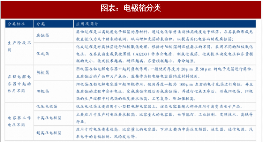 电极箔根据生产工艺可分为腐蚀箔和化成箔;根据在电容器中所起的作用不同可以分为阳极箔和阴极箔;根据后端电容器工作电压不同可分为低压电极箔(8vf-160vf)、中高压电极箔(160vf-600vf)、超高压电极箔(600vf-1000vf)。目前总体来看,国内低压高比容电极箔生产技术水平仍落后于日本,每年需要从日本进口高端铝箔。新疆众和、东阳光科、艾华集团等企业以通过持续的研发、生产不断布局高端电极箔。有望有效缓解大量进口低压高比容电极箔局面。
